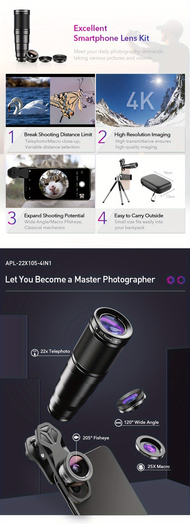 Nom du produit : APEXEL HD 22X Zoom – Kit Objectif Photo Smartphone 4-en-1