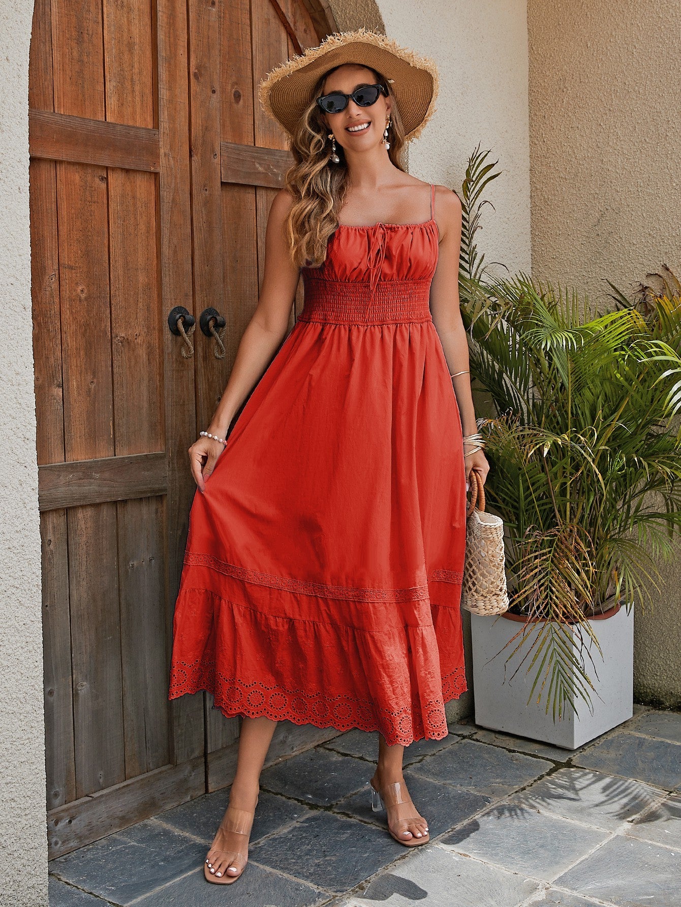 Dotée d'une jupe ample bordée de dentelle délicate, cette robe incarne l'élégance romantique à la française. Sa taille froncée élastique et son lien ajustable à la poitrine offrent une coupe souple et flatteuse qui convient à toutes les morphologies, alliant confort et style sans compromis.